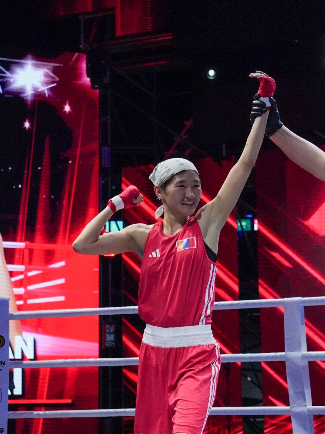 Tajikistan’s best female boxer, the Paris Olympian Mizhgona Samadova is a strong puncher at the women’s 57kg and she landed tough combinations to beat a local athlete, the former Asian medallist Nomin-Erdene Tugsjargal.