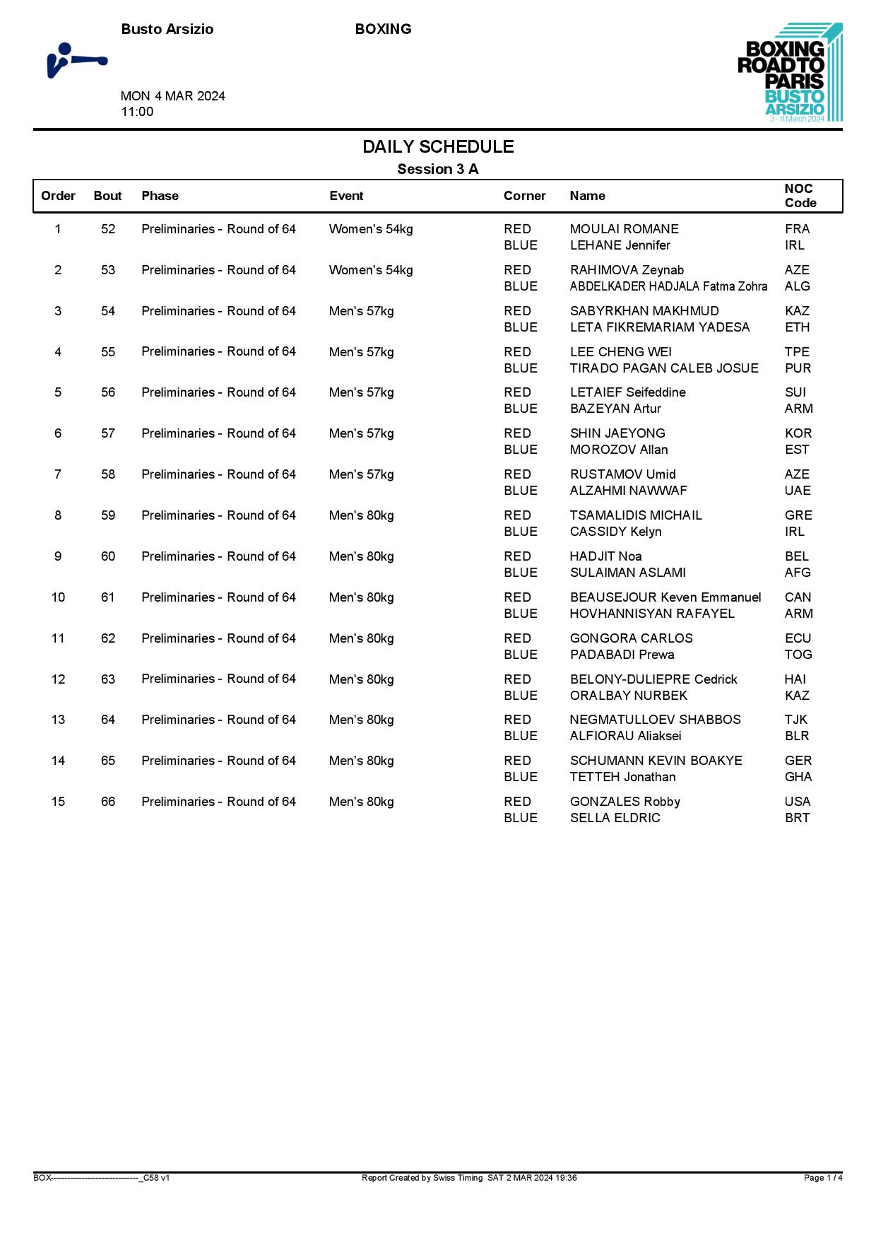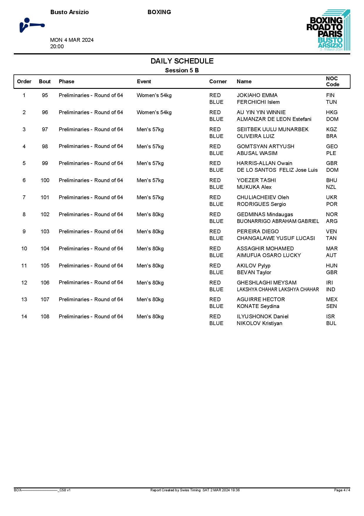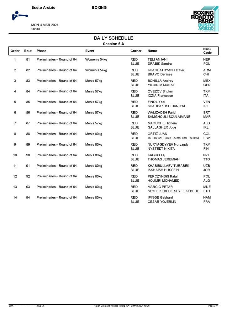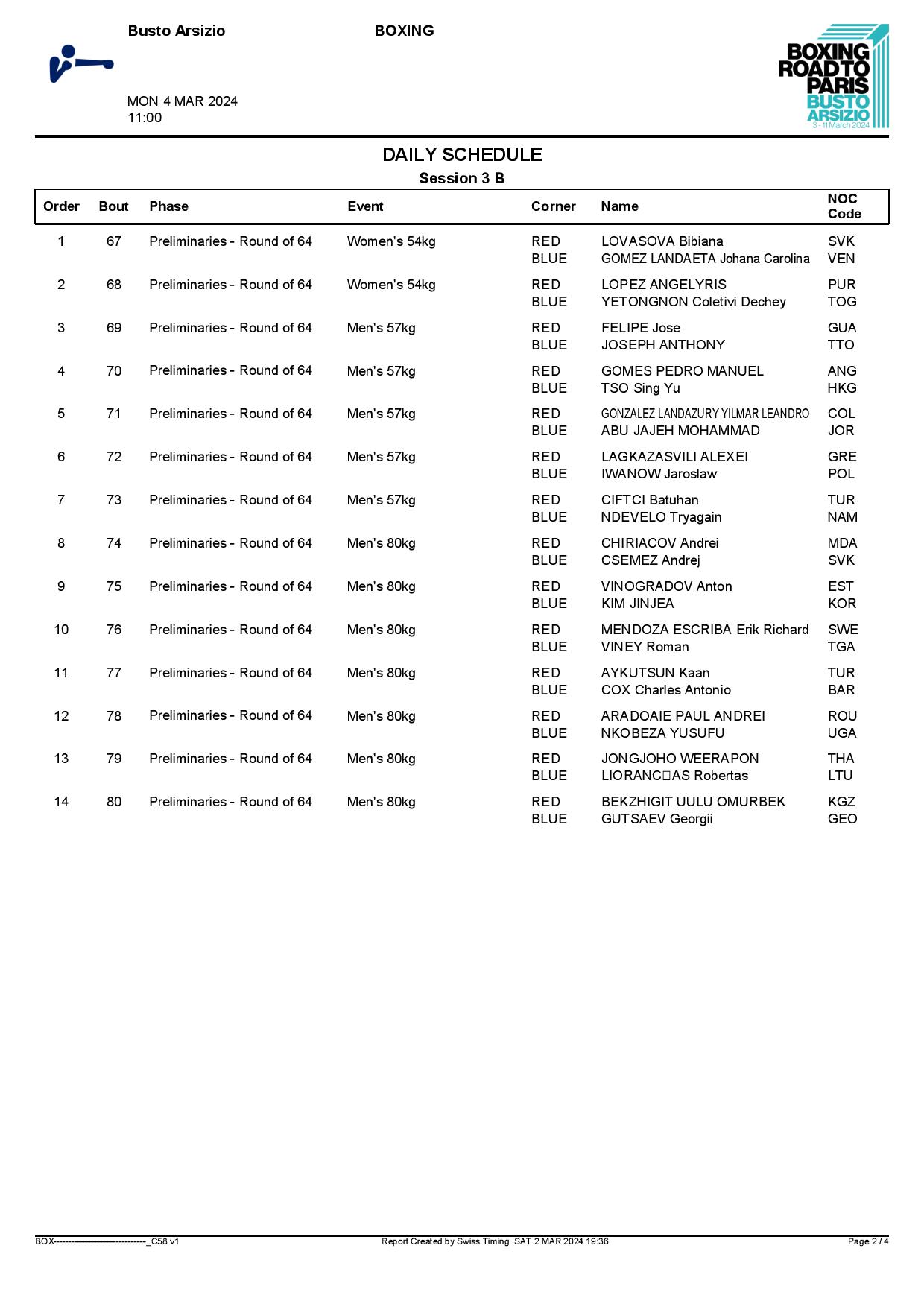 1st World Olympic Boxing Qualifying Event in Busto Arsizio - Day2 Schedule