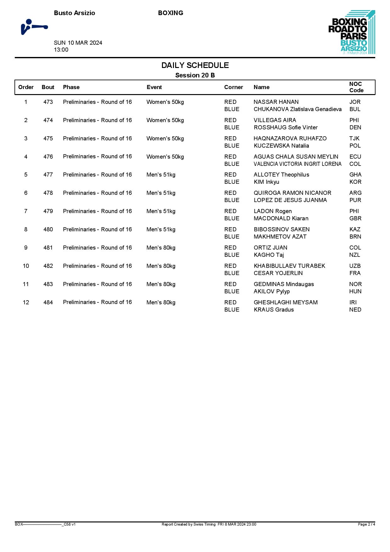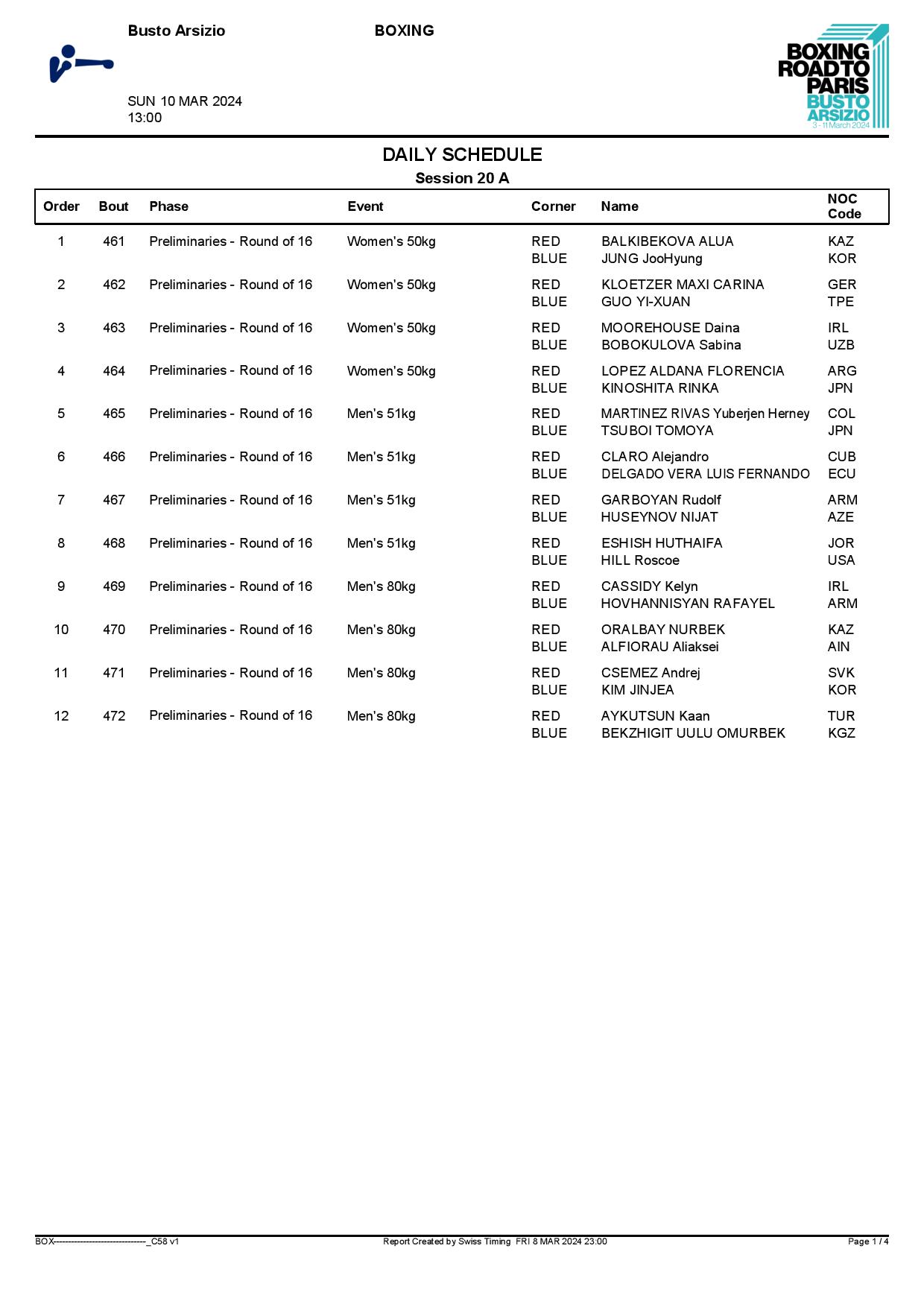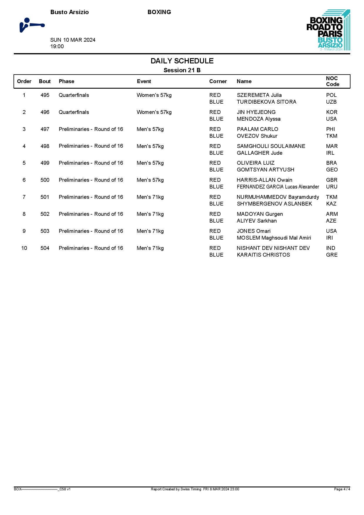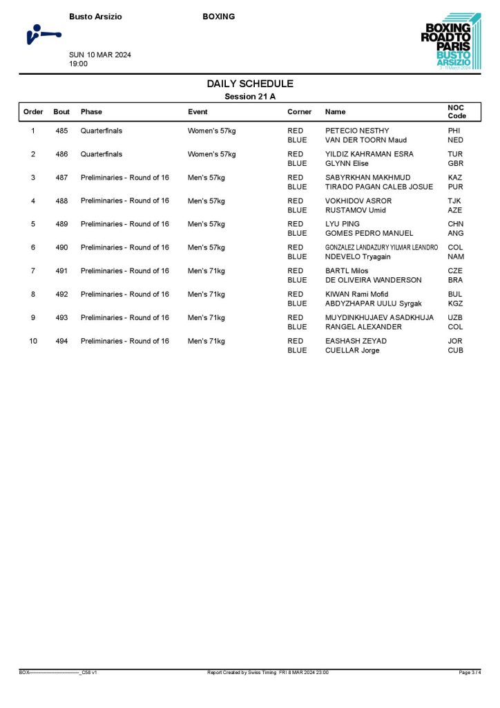 1st World Olympic Boxing Qualifying Event in Busto Arsizio - Day8 Schedule