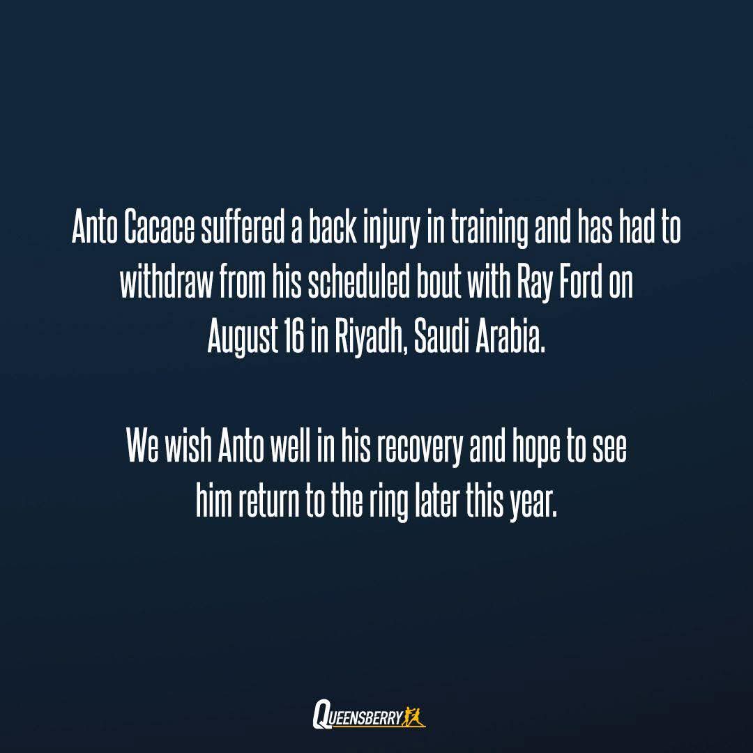 Anthony Cacace (24-1) withdrew from fight against Raymond Ford (17-1-1) that was scheduled to be held on August 16 in Riyadh, Saudi Arabia.