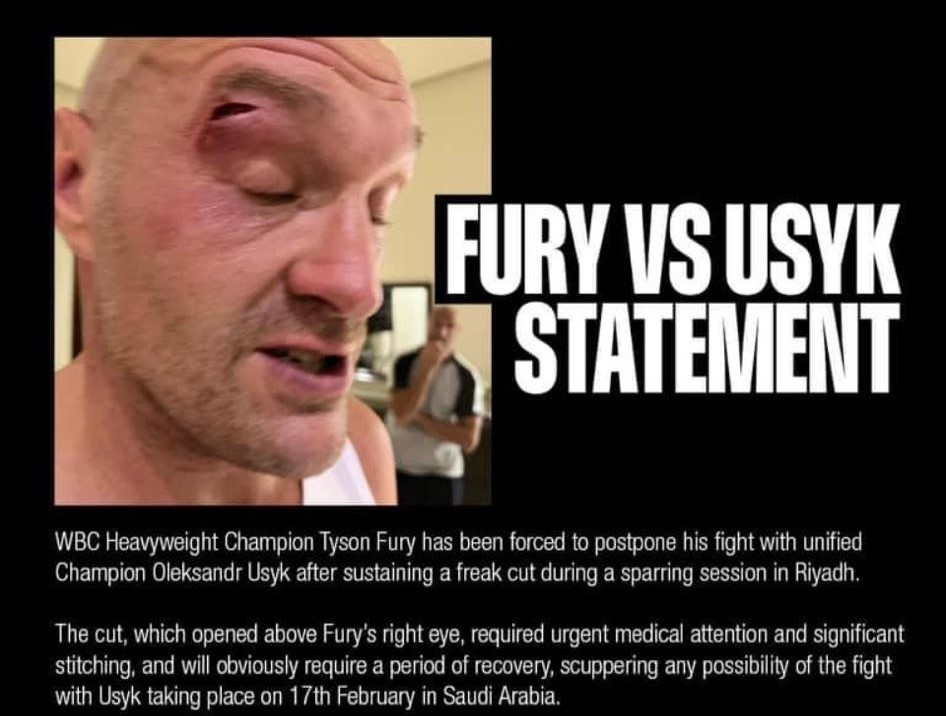 “WBC Heavyweight Champion Tyson Fury has been forced to postpone his fight with unified Champion Oleksandr Usyk after sustaining a freak cut during a sparring session in Riyadh. The cut, which opened above Fury’s right eye, required urgent medical attention and significant stitching and will obviously require a period of recovery, scuppering any possibility of the fight with Usyk taking place on 17th February in Saudi Arabia”, Queensberry Promotions said in a statement.