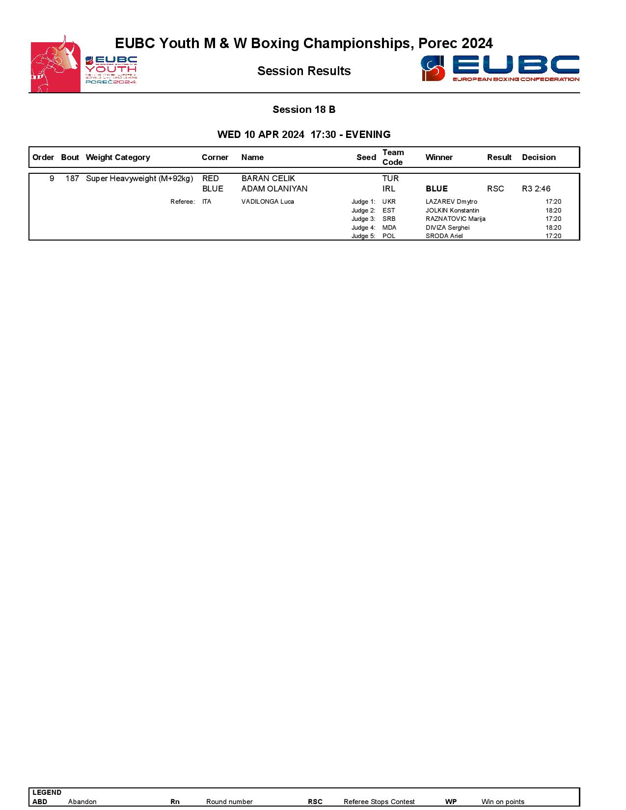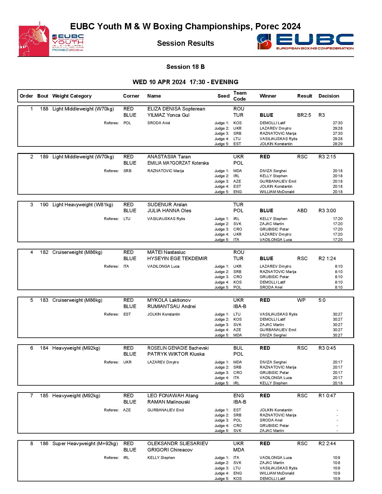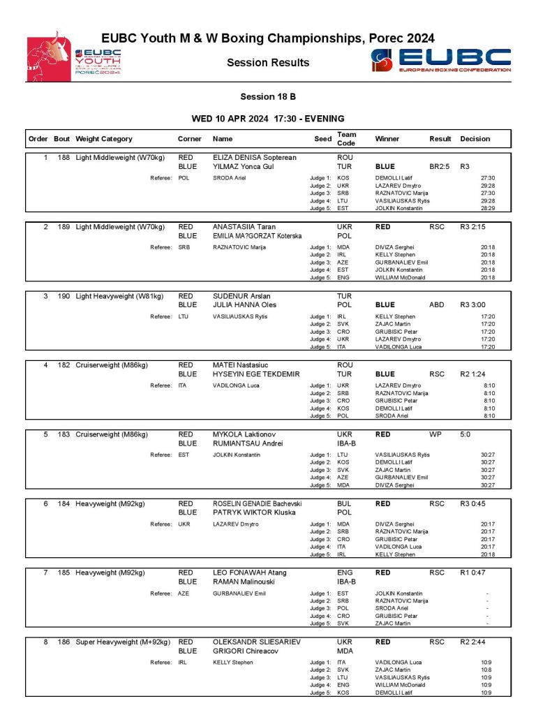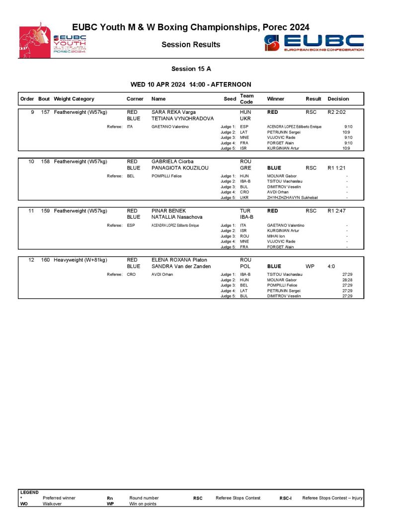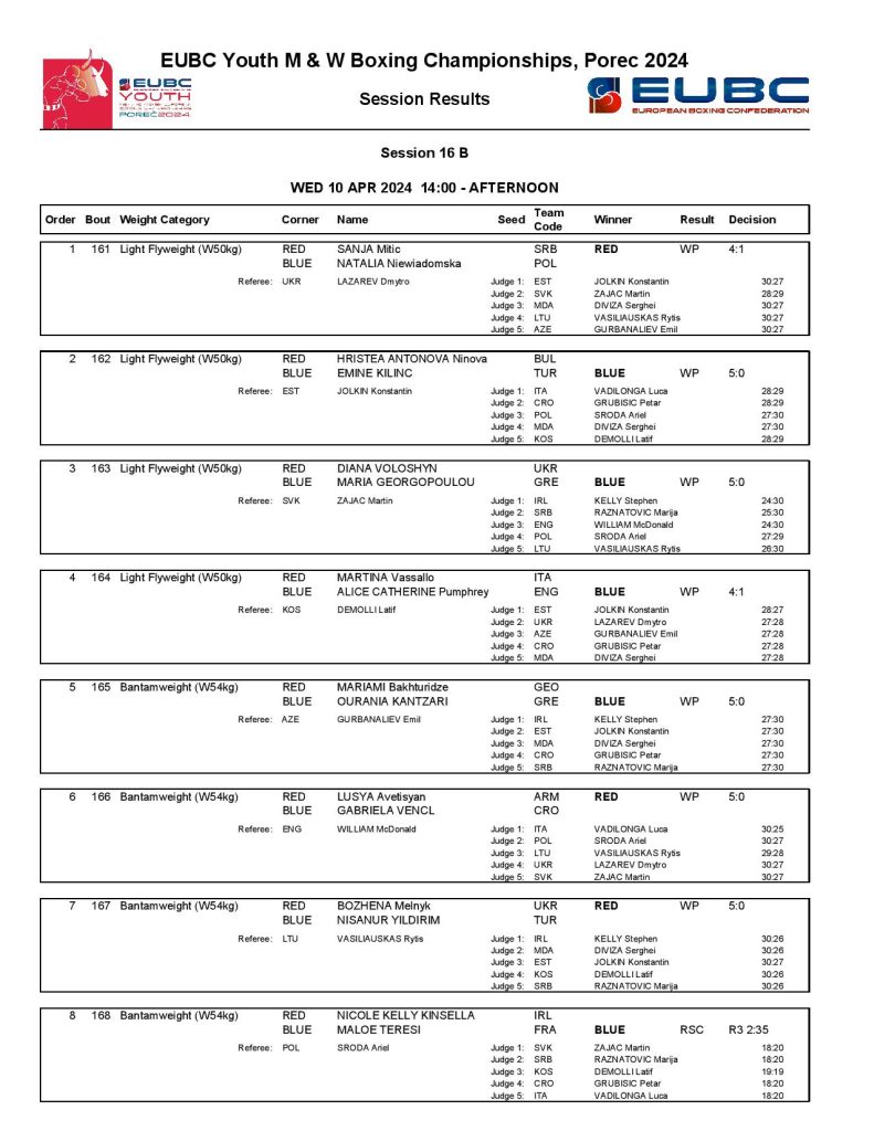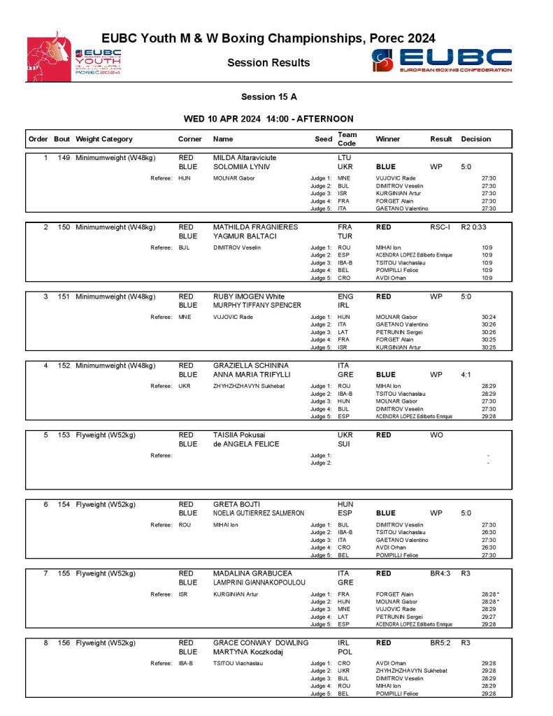 Greece’s Anna Maria Tryfilli had a narrow battle against Italy’s Graziella Schinina but she was favoured in four out of the five scorecards. Another top women’s minimumweight (48kg) boxer, the European Junior Champion Ruby White of England dominated her quarter-final against Ireland’s Tiffany Murphy.