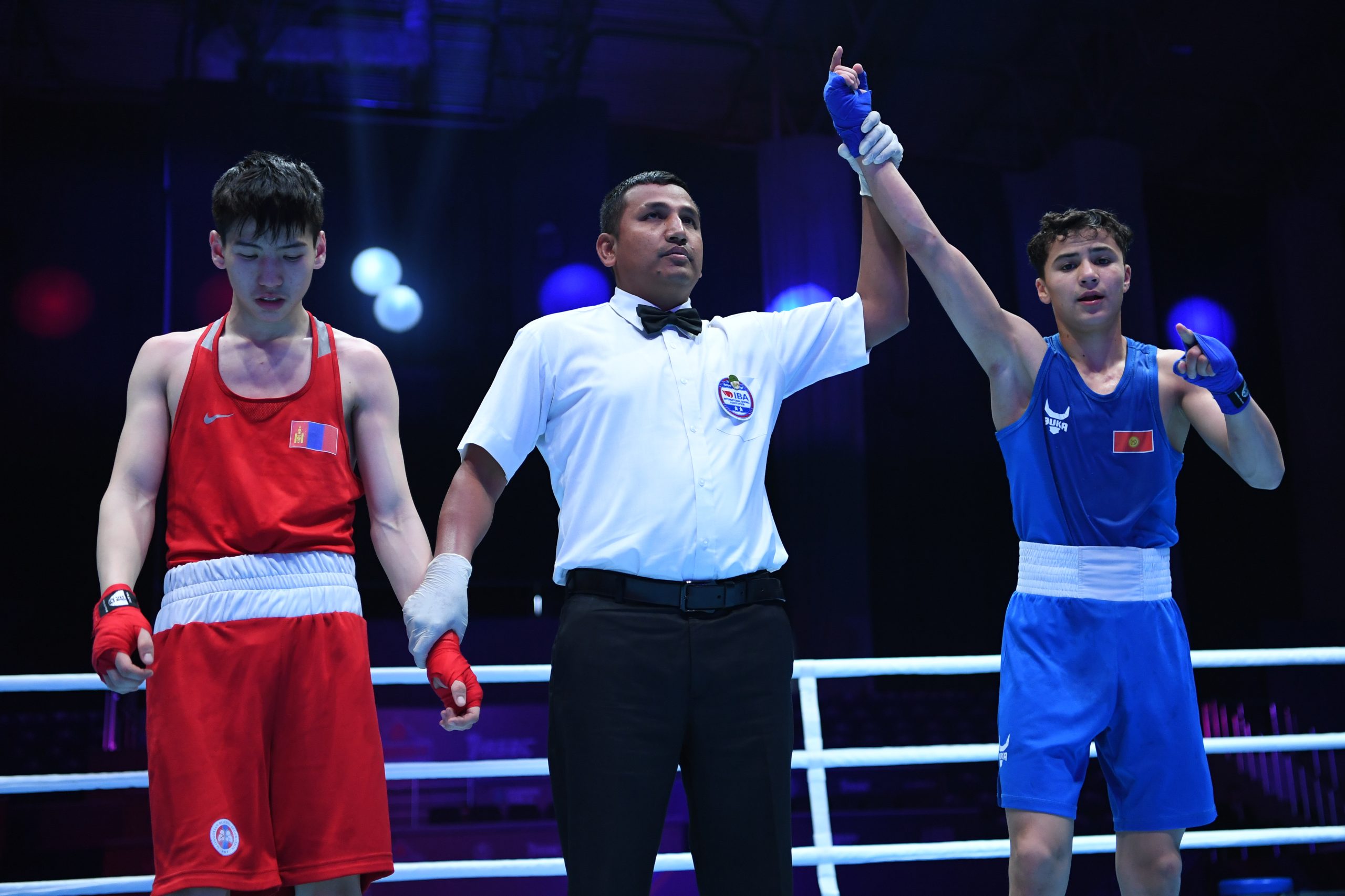 Kyrgyzstan’s Junior World Champion Amantur Dzhumayev ruled the middle of the ring against Iran’s Amirreza Soltani who used long distance today. The Kyrgyz bantamweight (54kg) boxer earned several historic junior results in 2023 and he began the second round in a higher tempo effectively.