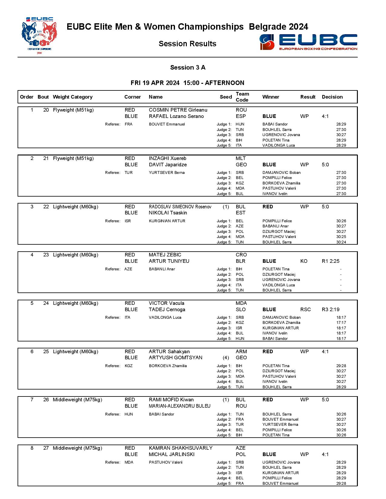 France’s Lounes Hamraoui, the silver medallist from the last edition, used his footwork to catch Serbia’s Stefan Camovic with his counter-attacks and he succeeded today. Another host nation boxer, Almir Memic was energetic and he stopped Israel’s Jonathan Arnon in their middleweight (75kg) contest.