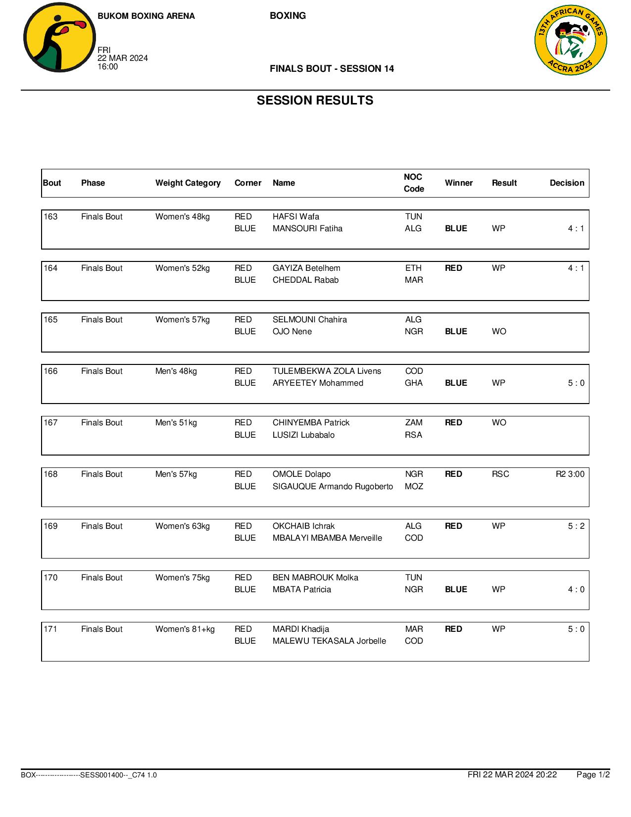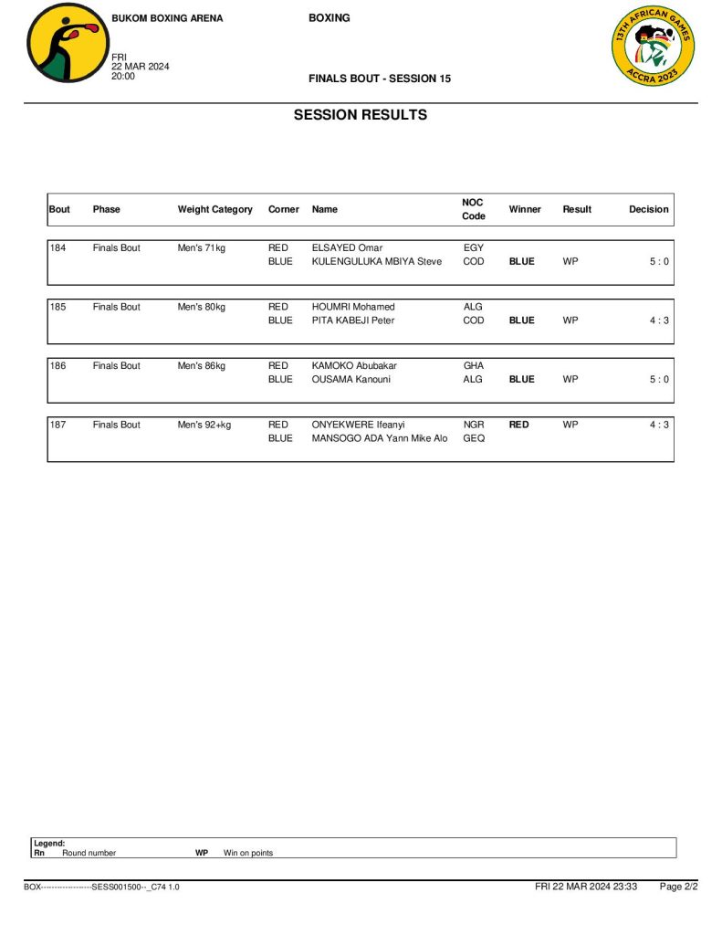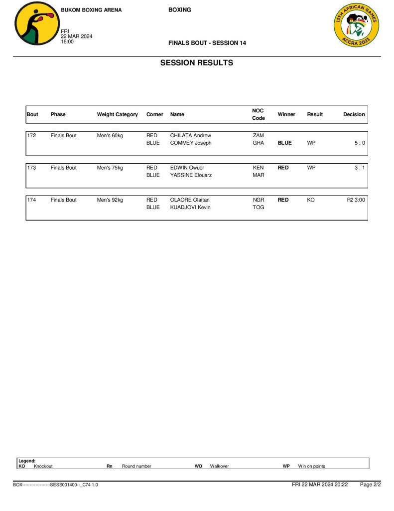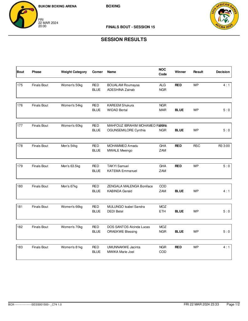 Ghana’s Mohammed Aryeetey defeated DR Congo’s Livens Tulembekwa in the first male final at the minimumweight (48kg). Amadu Mohammed earned the host nation’s second title at the men’s bantamweight (54kg) following his RSC success over Zambia’s Mwengo Mwale.