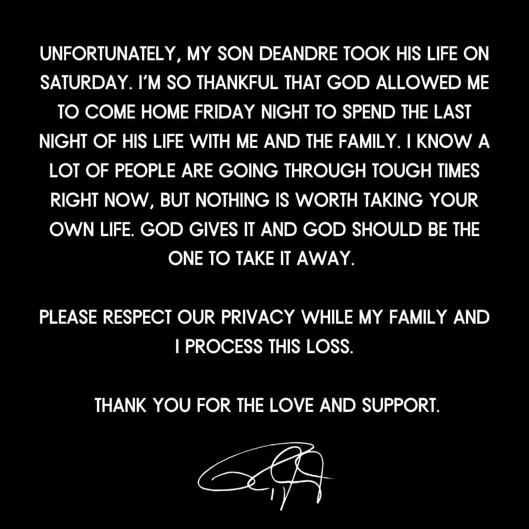 "I'm so thankful that God allowed me to come home Friday night to spend the last night of his life with me and the family," Jones Jr said in a statement on X. "I know a lot of people are going through tough times right now, but nothing is worth taking your own life."