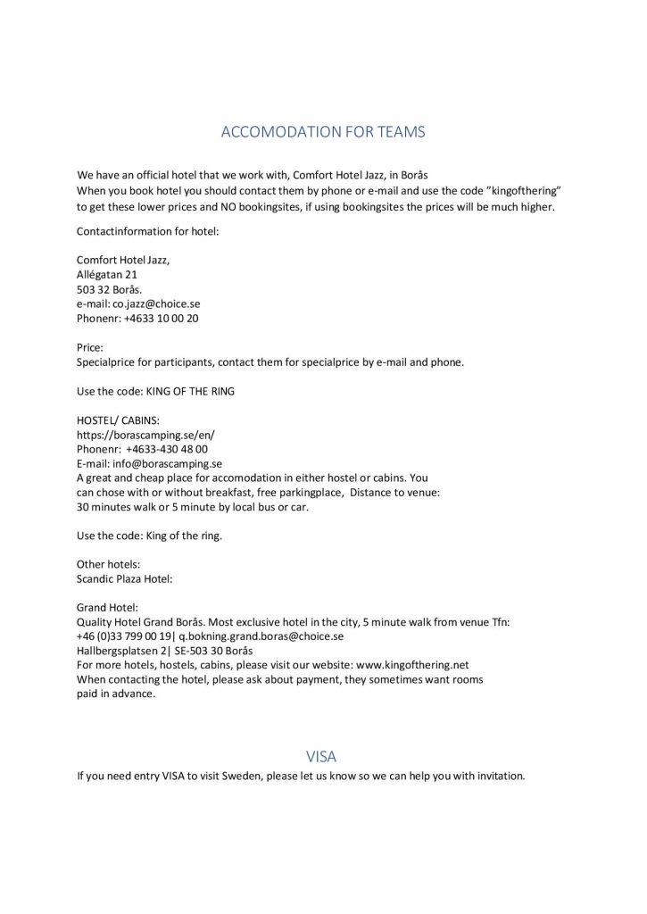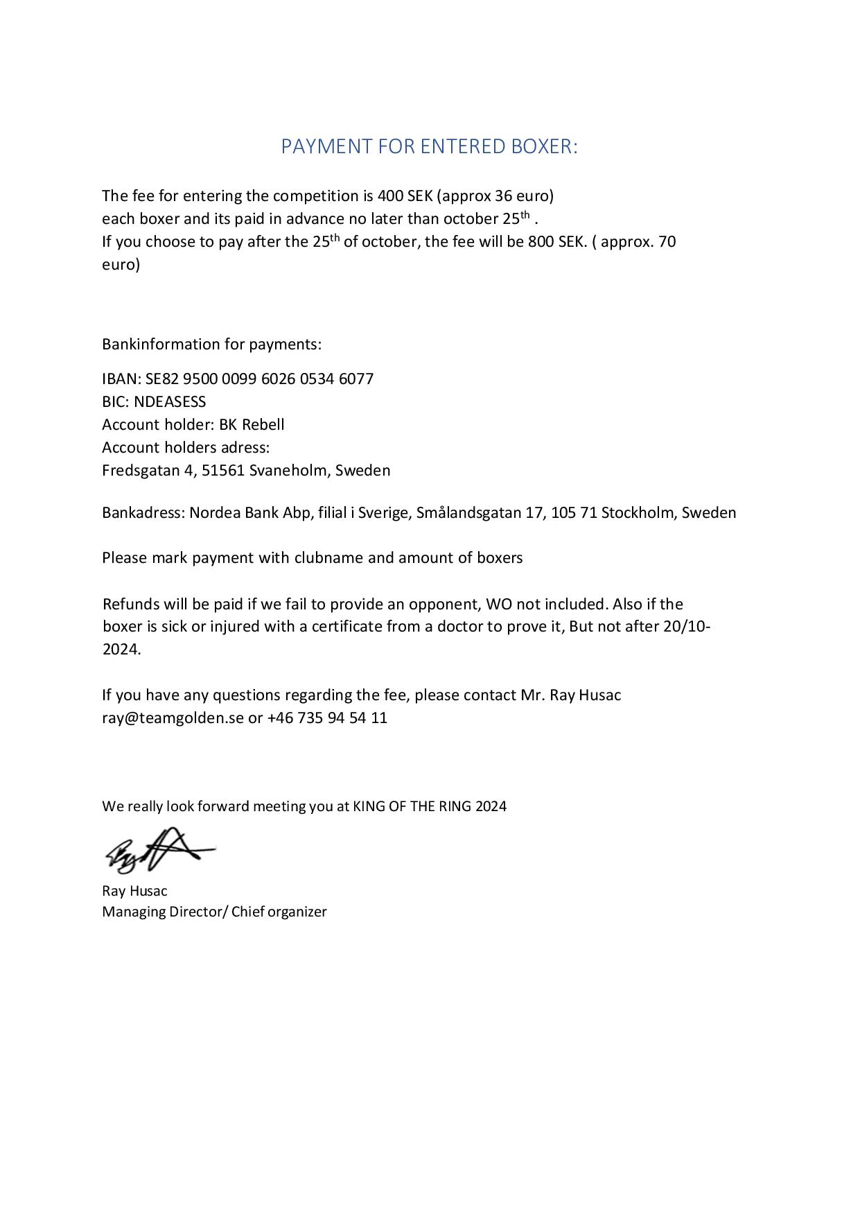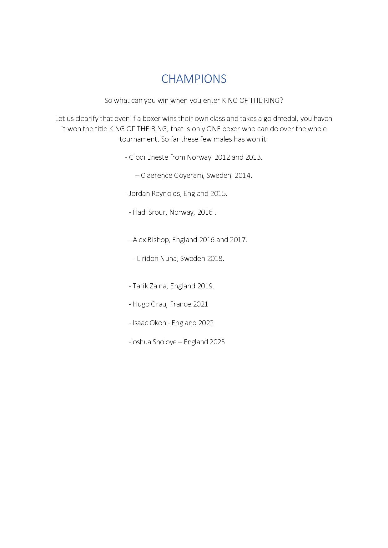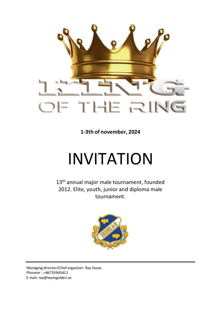 The King of the Ring Tournament will be held for the men’s elite, youth, junior and schoolboys age groups in the traditional venue of the city of Boras.